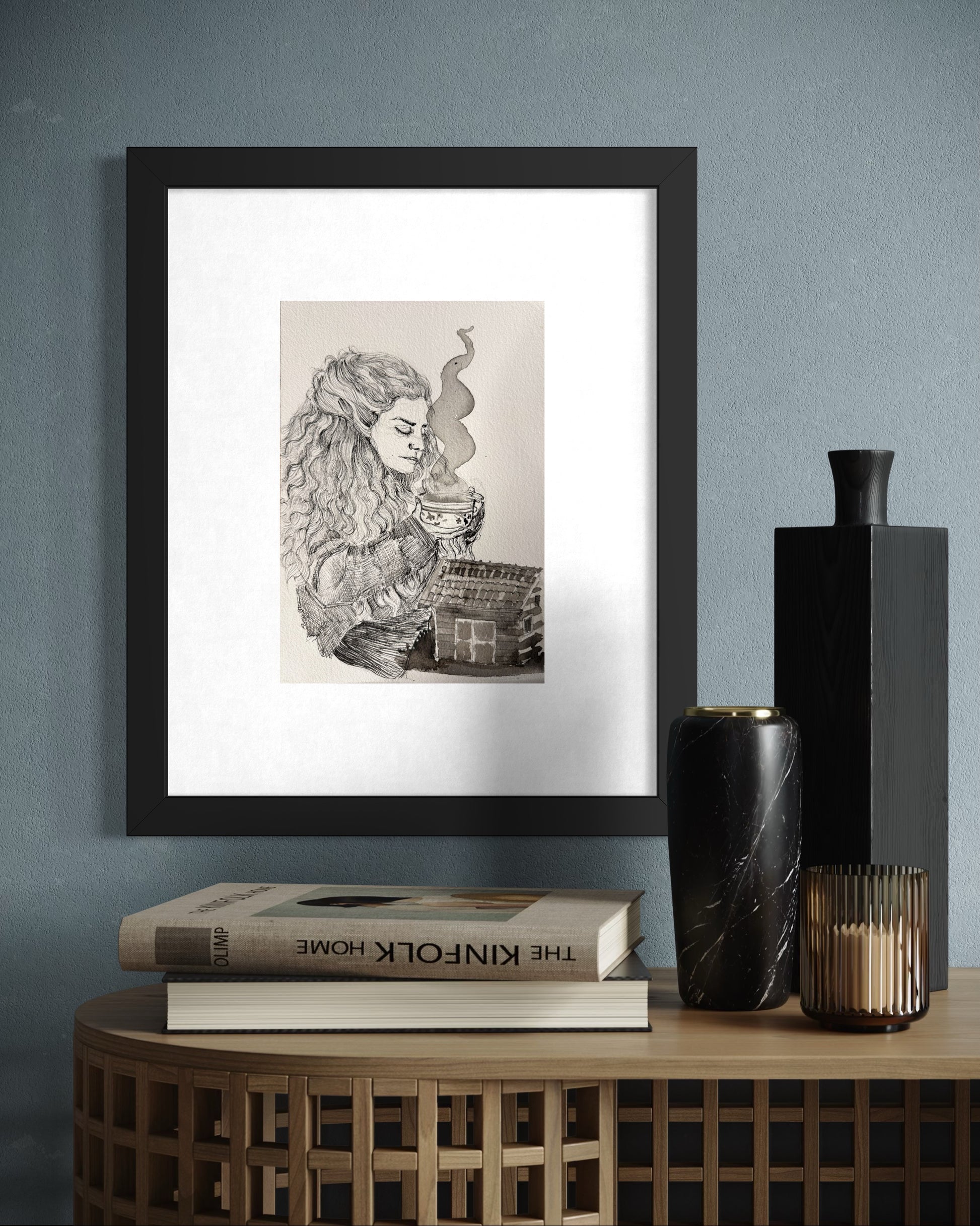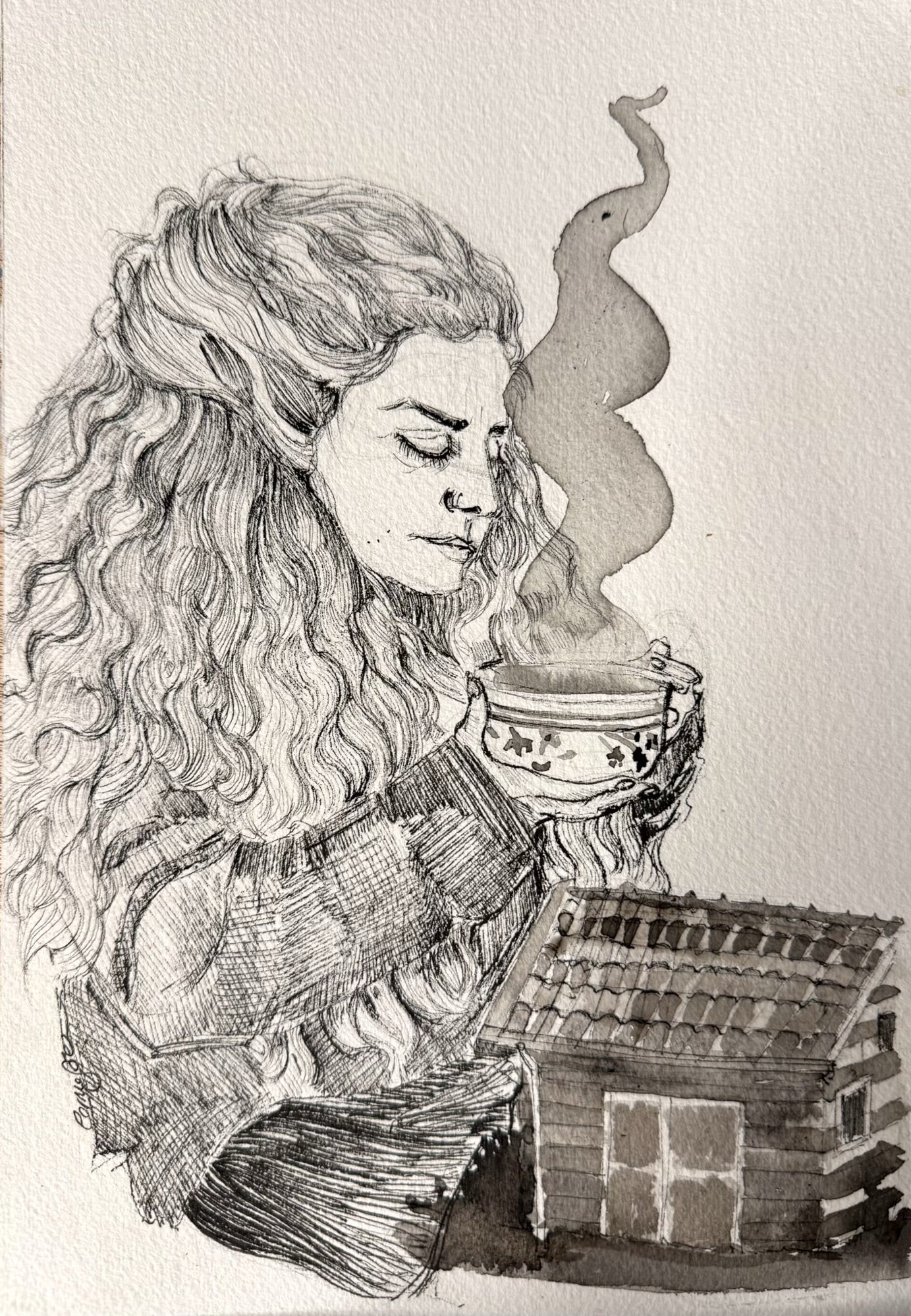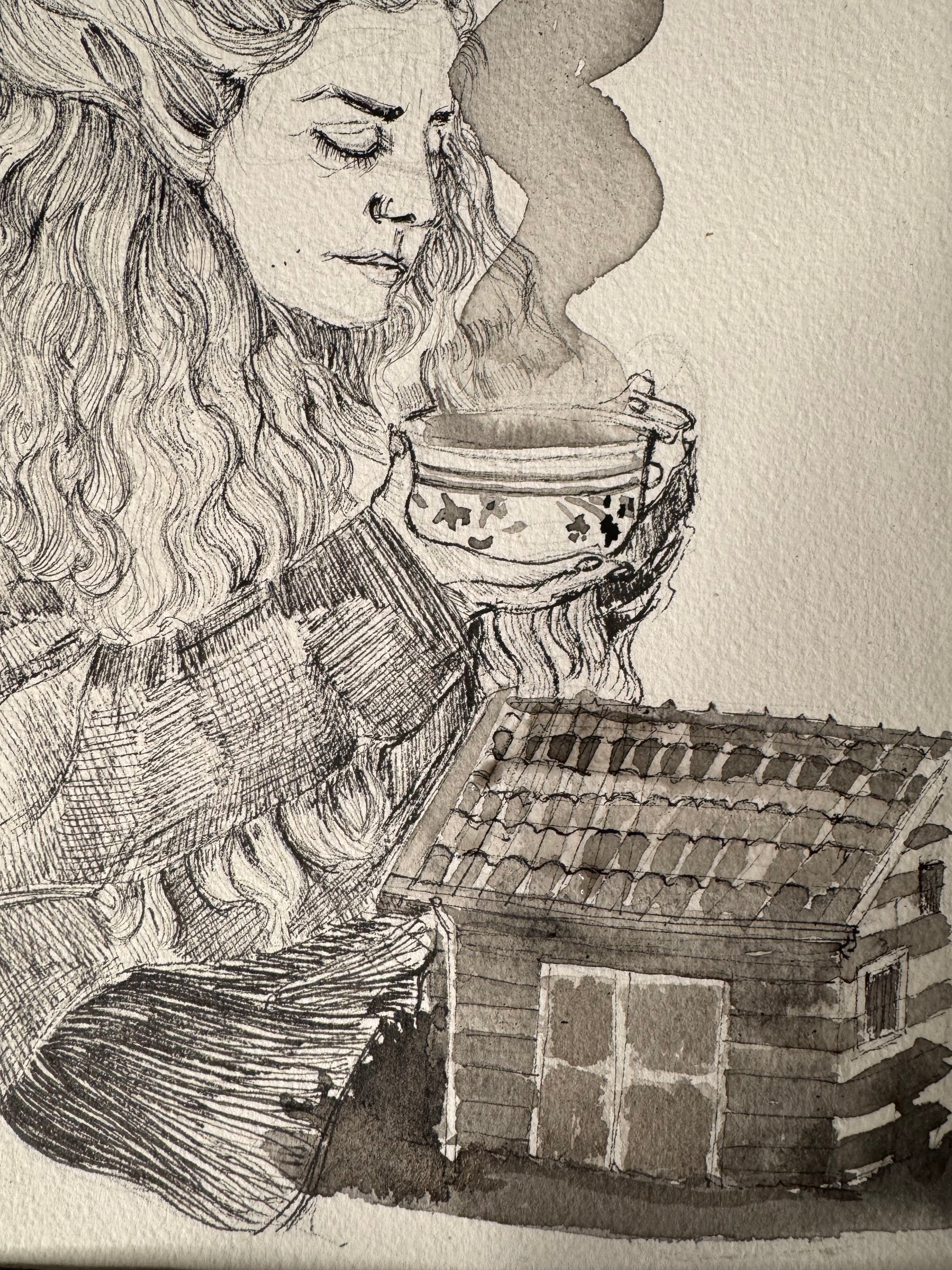 “Calor en Medio del Bosque” es una obra en tinta que nace de un momento íntimo: