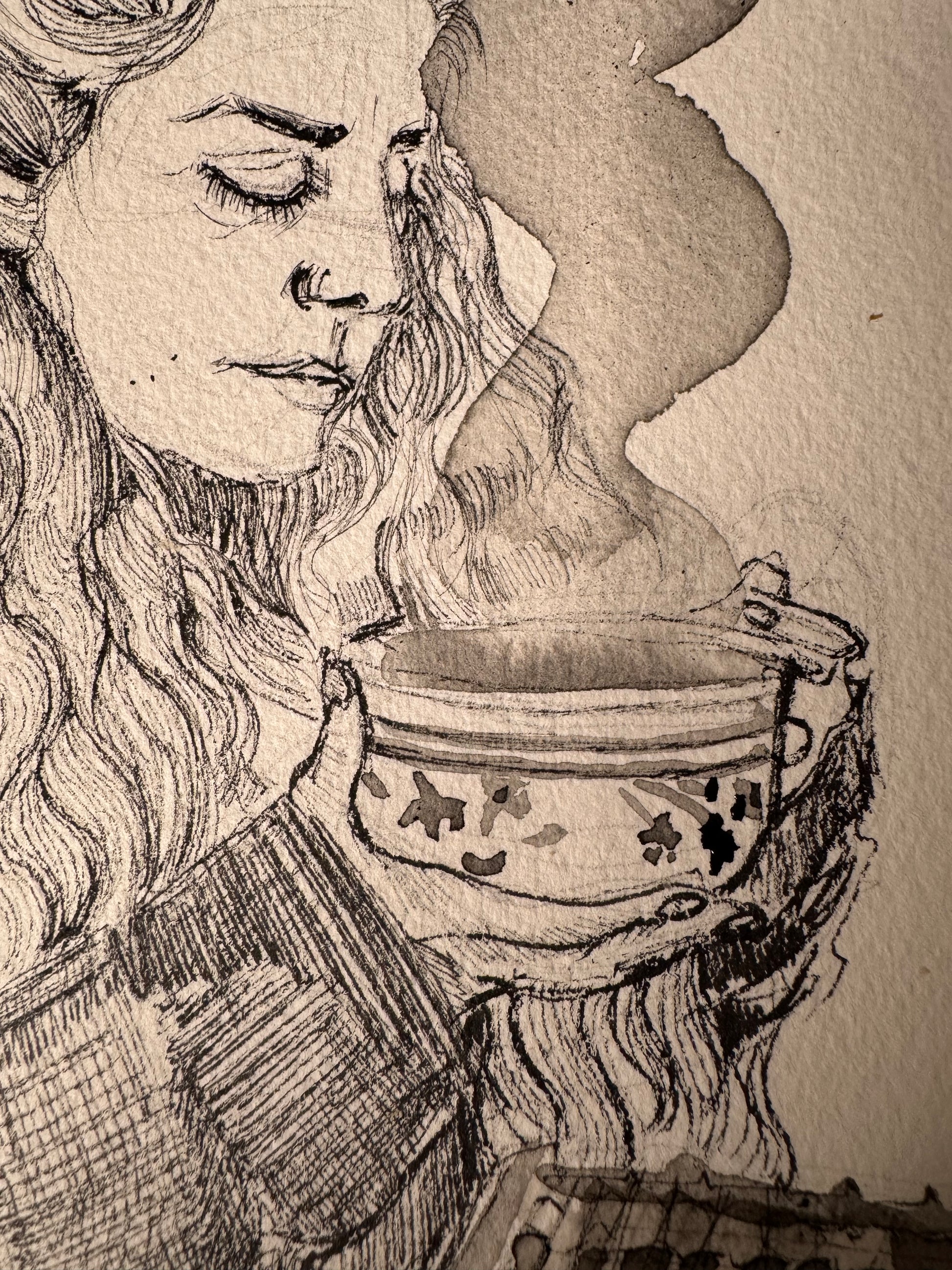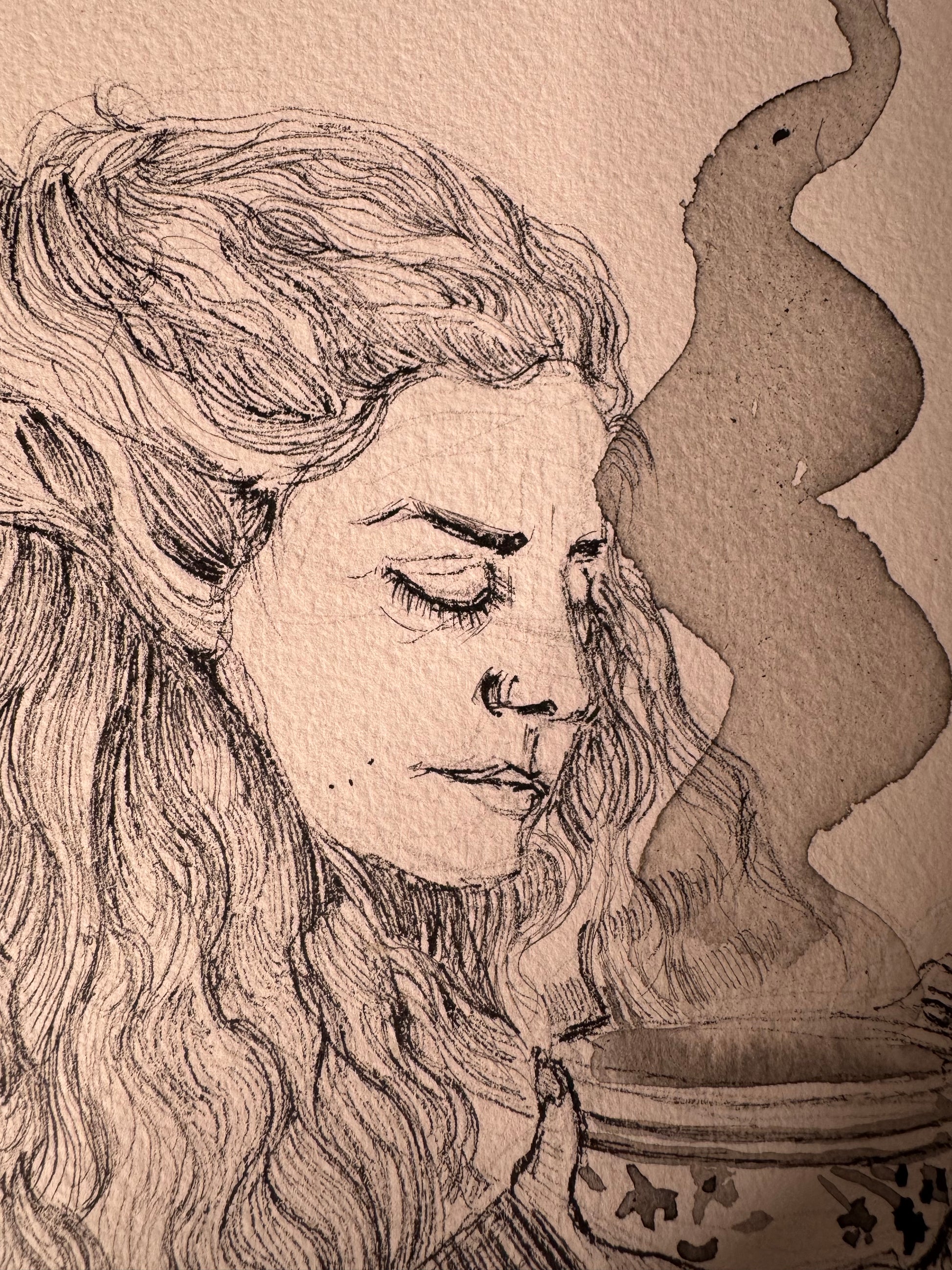 Siempre he encontrado en el bosque un espacio de verdad, donde puedo escucharme sin ruido. Dibujarme allí, con esa taza que parece abrazarme, es como dejar constancia de un ritual: