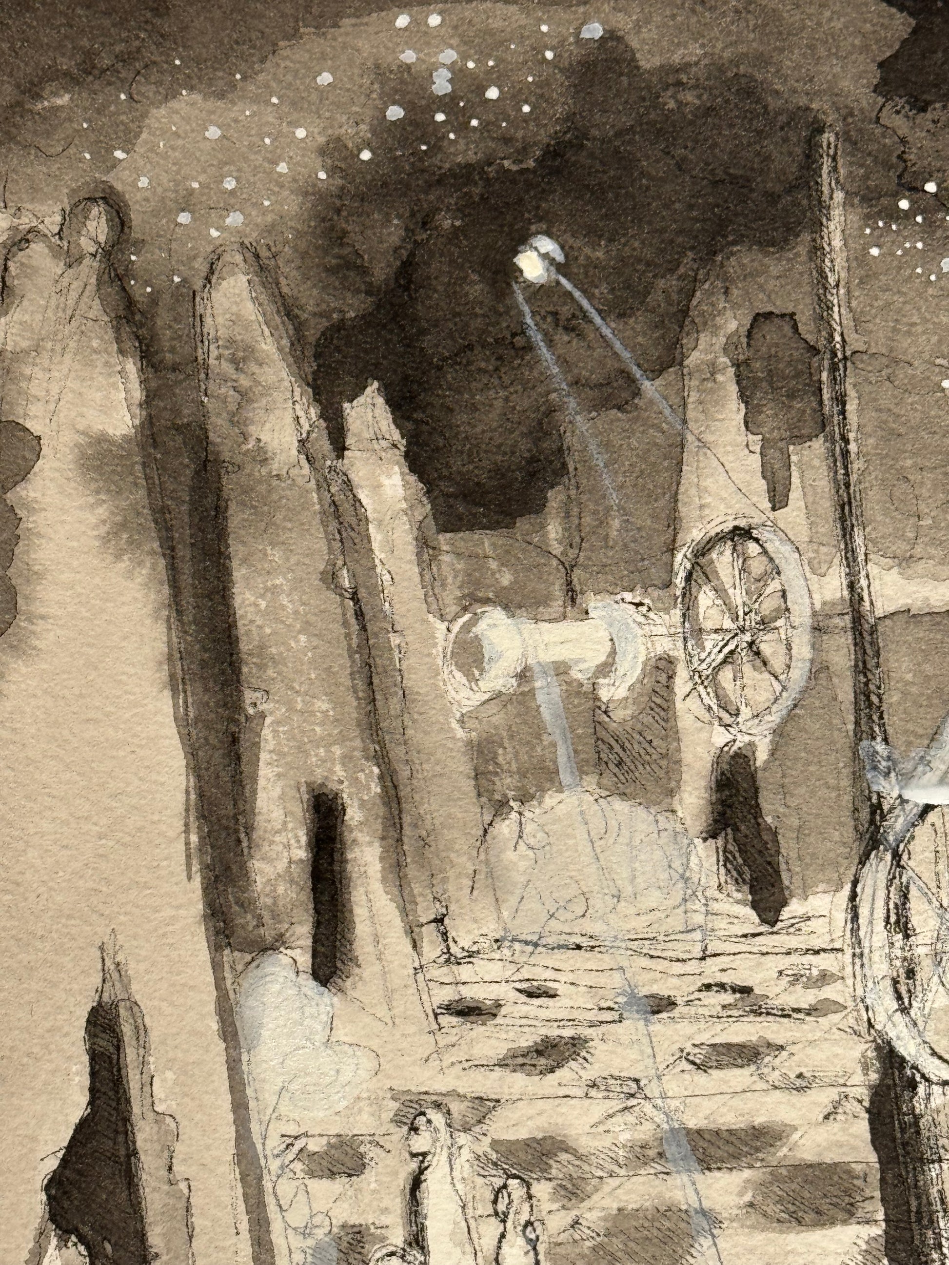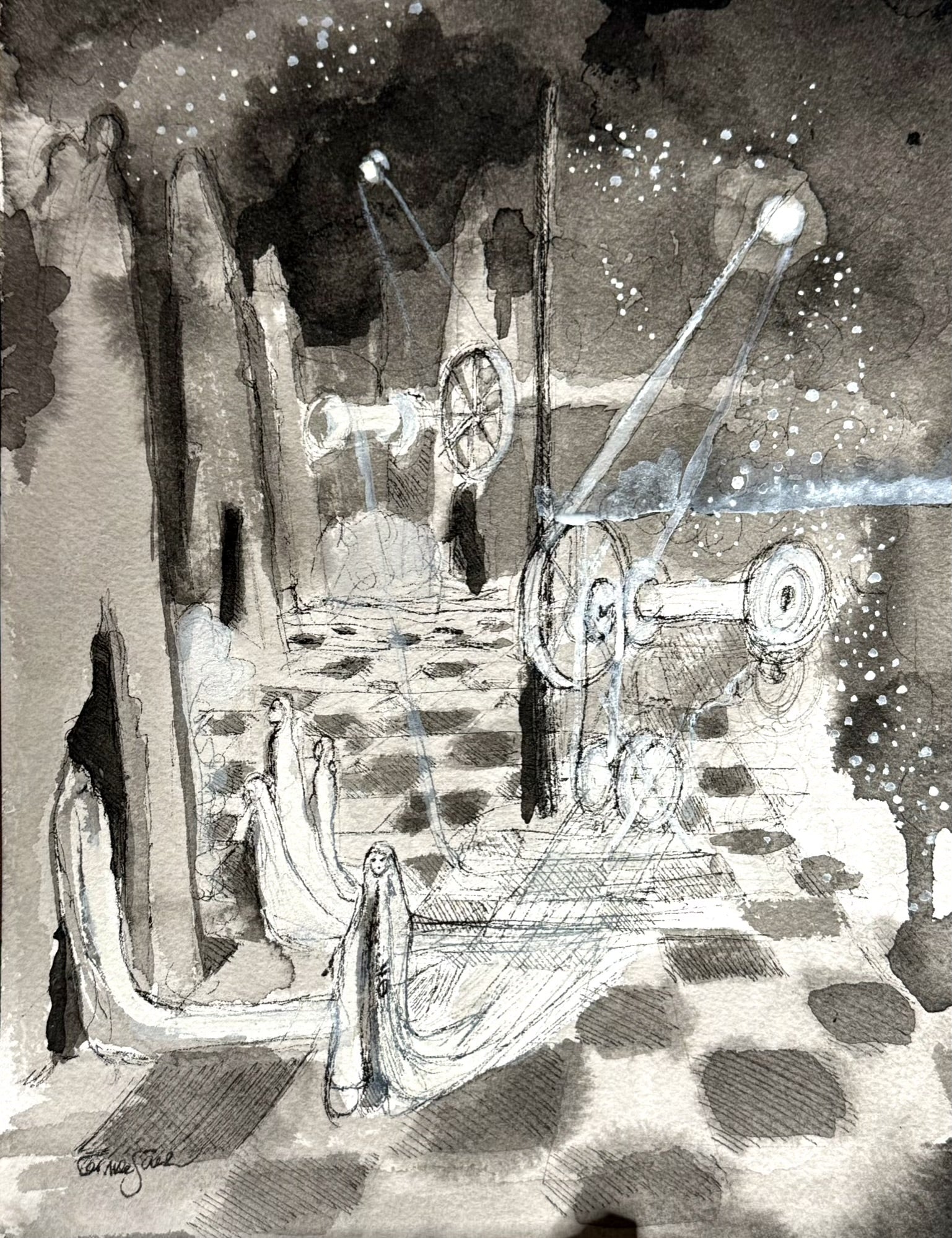 En esta pieza, recreo un pasillo onírico donde figuras alargadas avanzan en silencio, guiadas por máquinas imposibles, ruedas que tejen luz y engranajes que parecen mover el destino. Todo el espacio vibra como si fuera un mecanismo interior: un sueño que se despliega, un pensamiento que viaja, un mundo que se construye desde adentro hacia afuera.