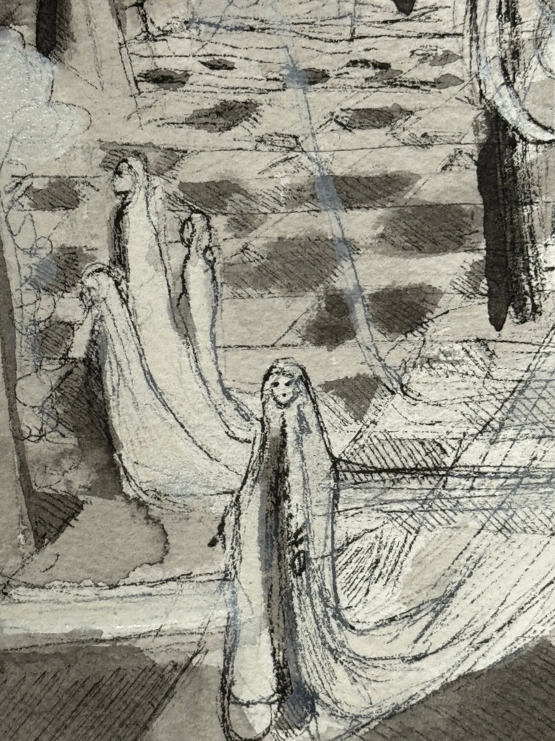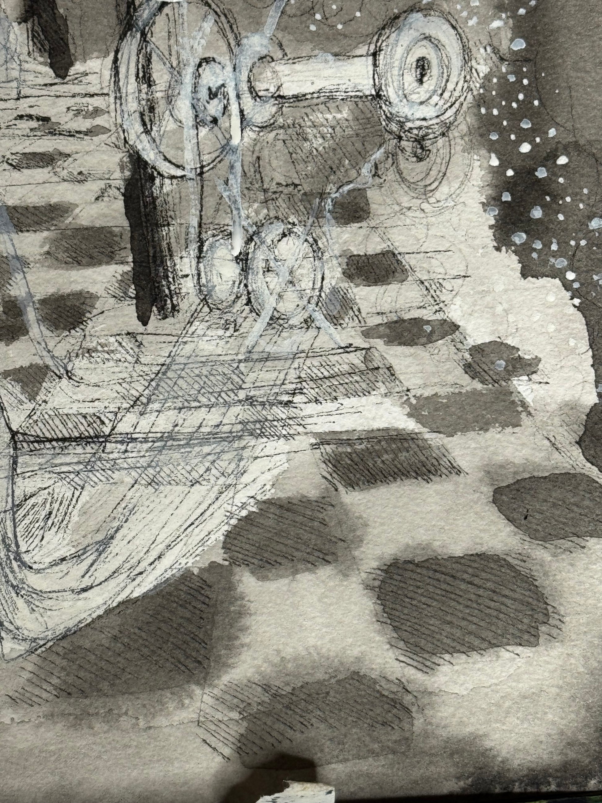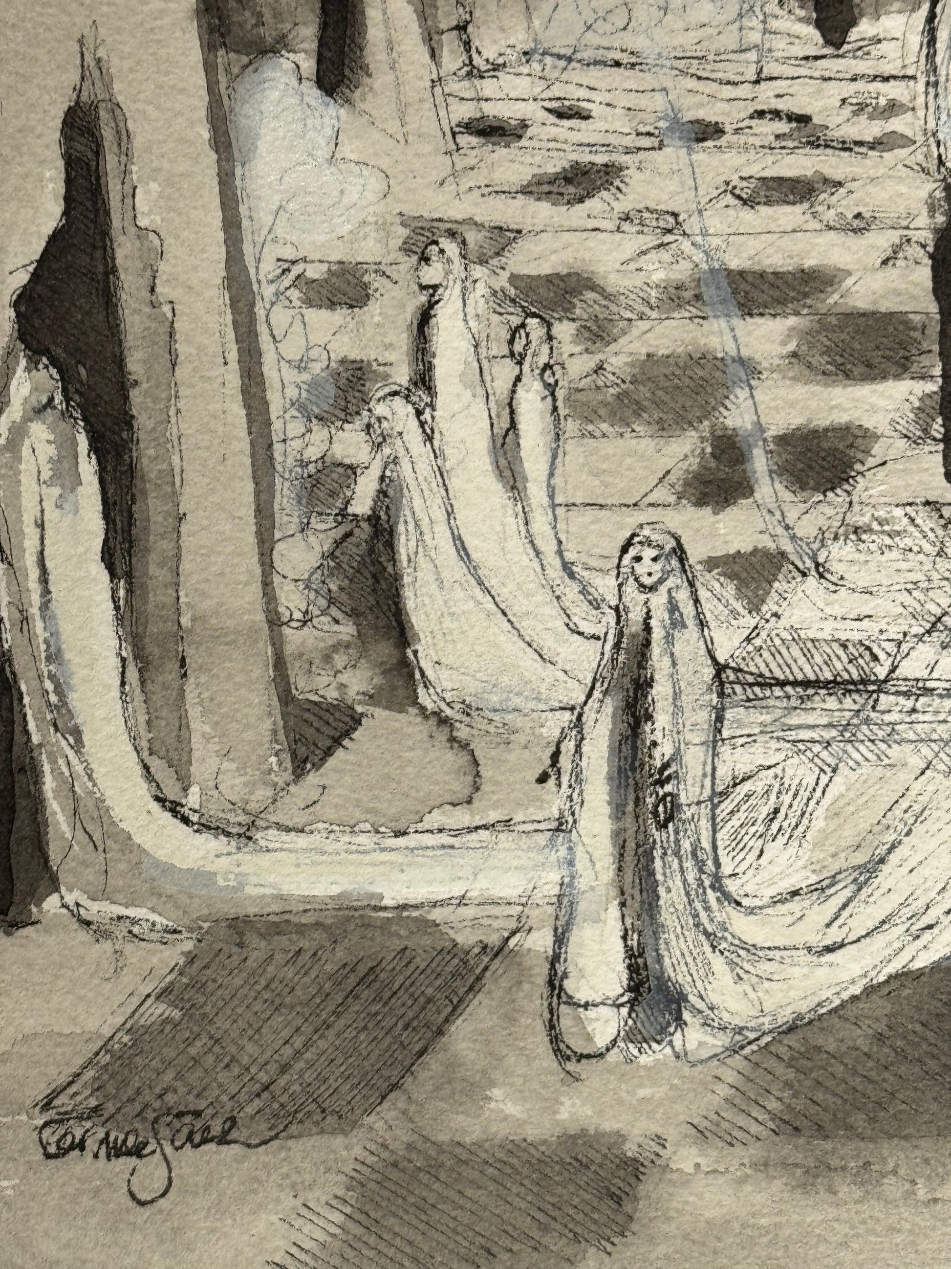 La tinta, con sus sombras densas y líneas entrecruzadas, me permitió explorar ese territorio liminal entre realidad y visión. Este dibujo es un homenaje a ese impulso creativo que nace en el interior y se manifiesta como arquitectura emocional.