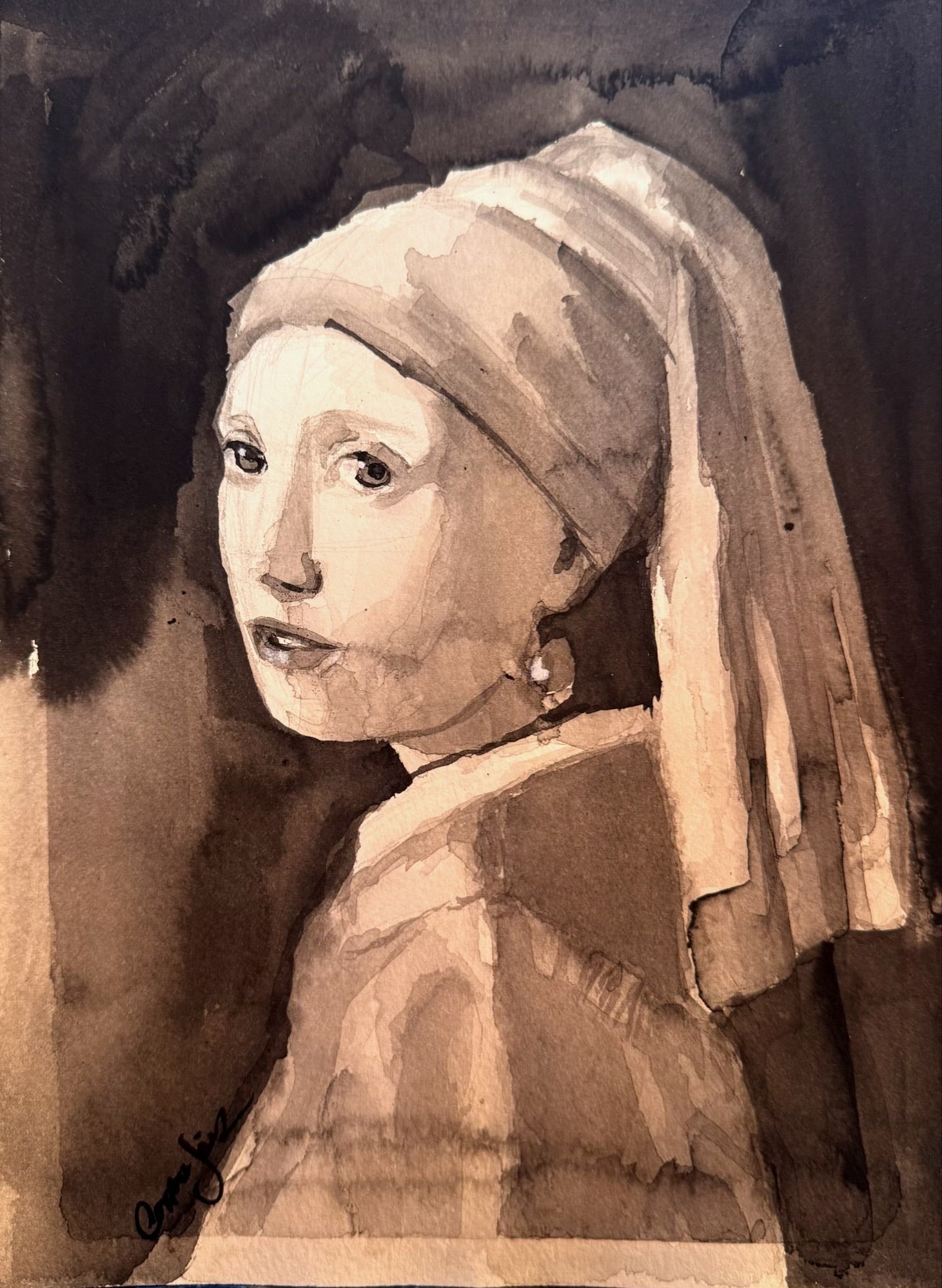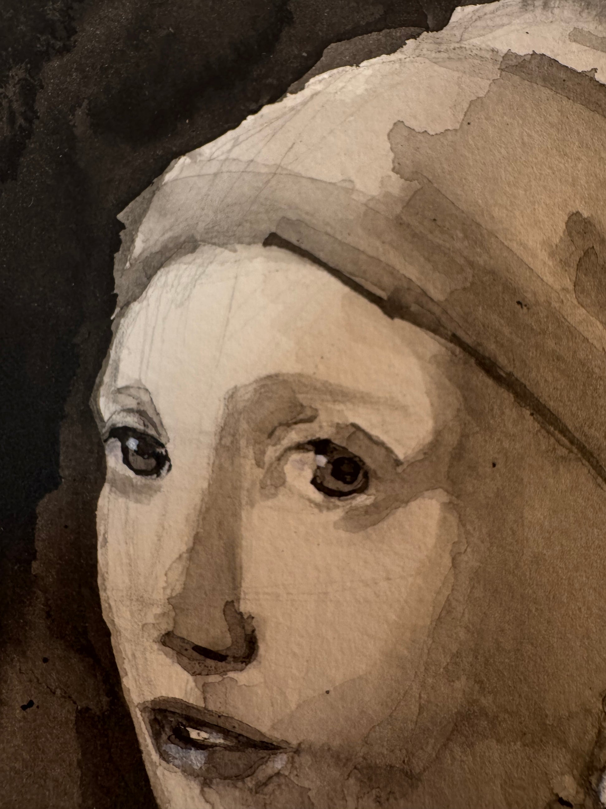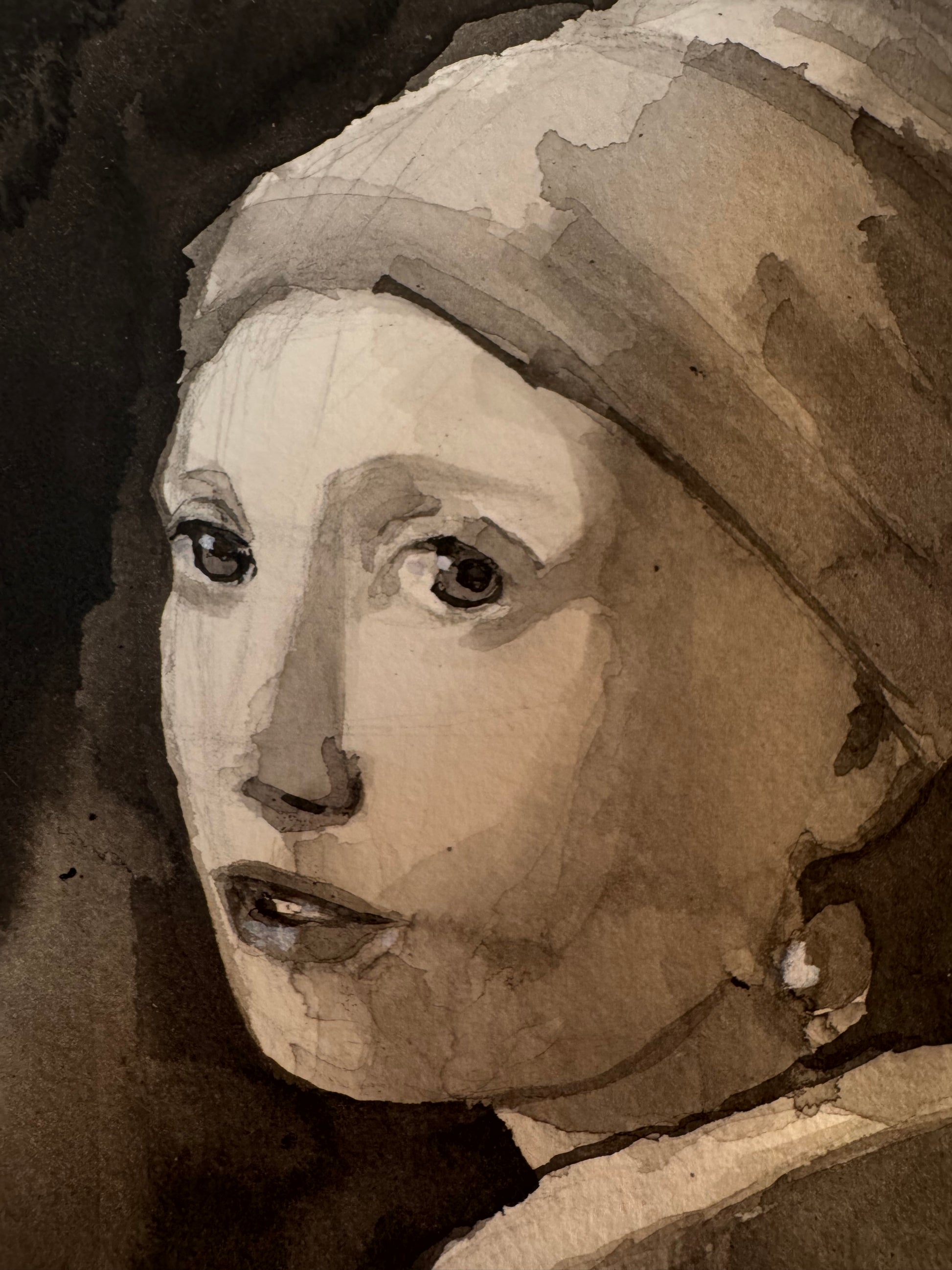 La obra forma parte de Inktober 2025, mi recorrido personal por referentes que han marcado mi sensibilidad. Vermeer siempre ha sido para mí un recordatorio de que la quietud también puede ser poderosa, y que una sola mirada basta para sostener un cuadro entero.