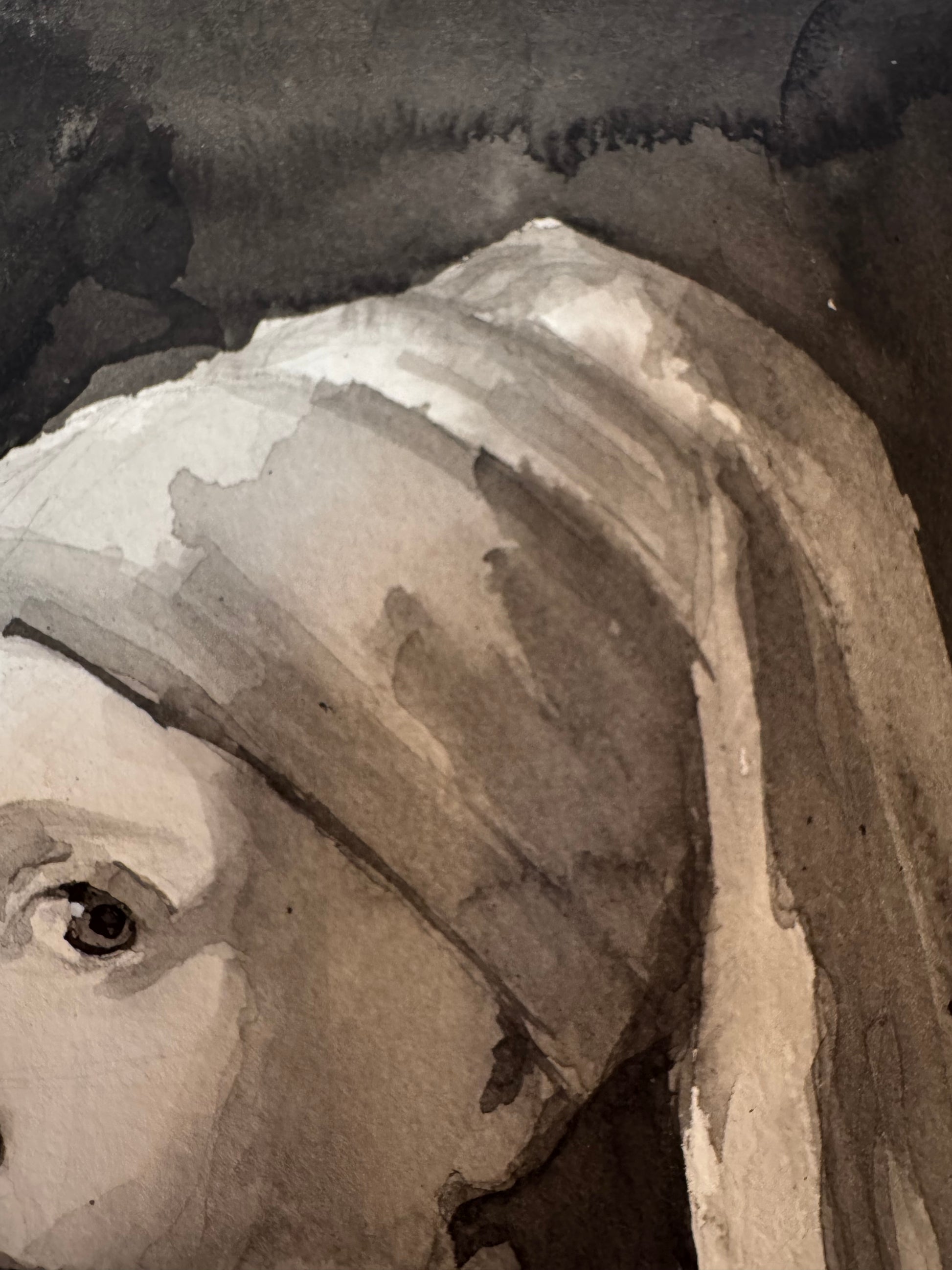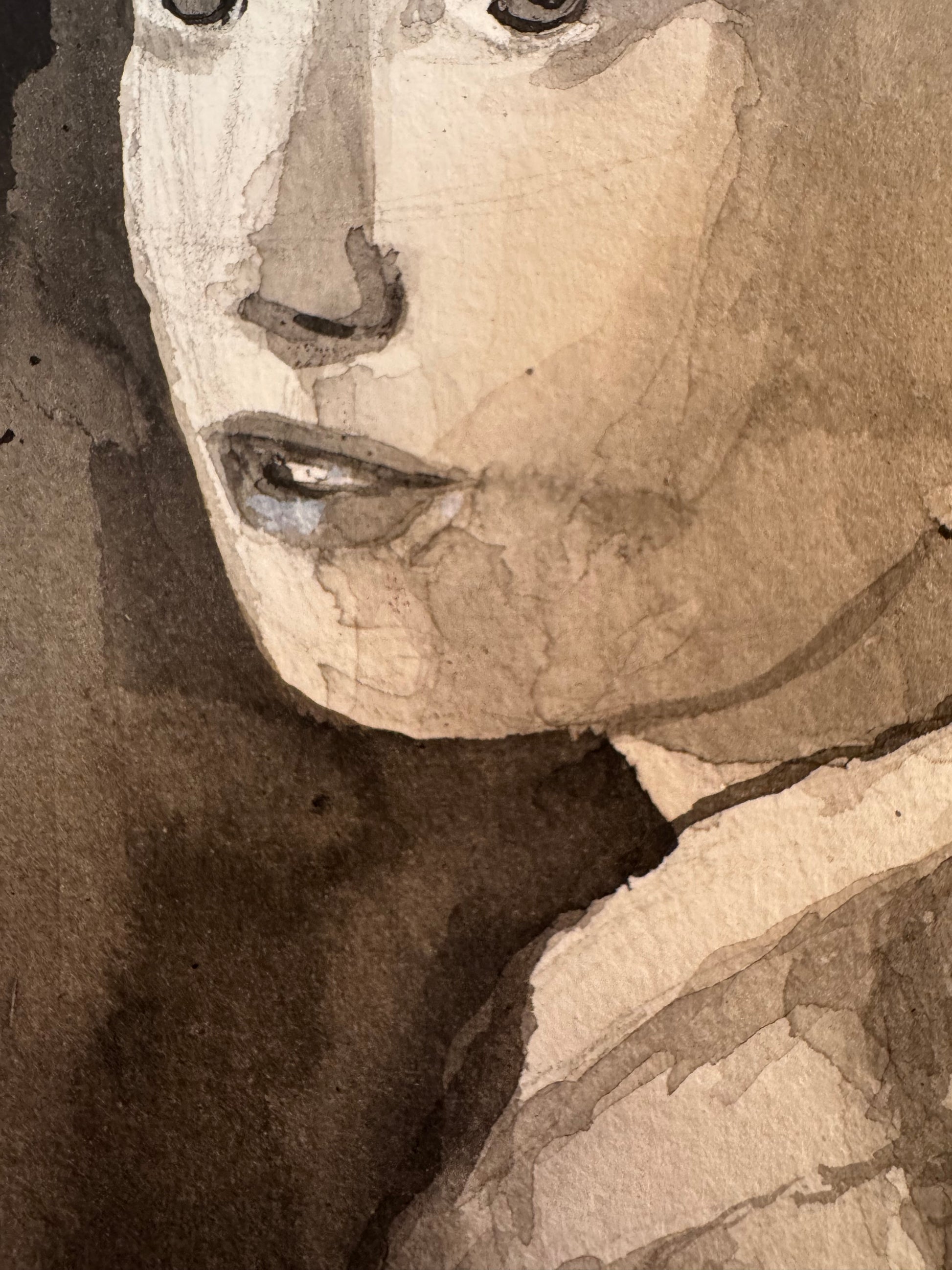 “El Silencio que Mira” es mi reinterpretación en tinta de La joven de la perla de Johannes Vermeer, una de las miradas más enigmáticas de toda la historia del arte.