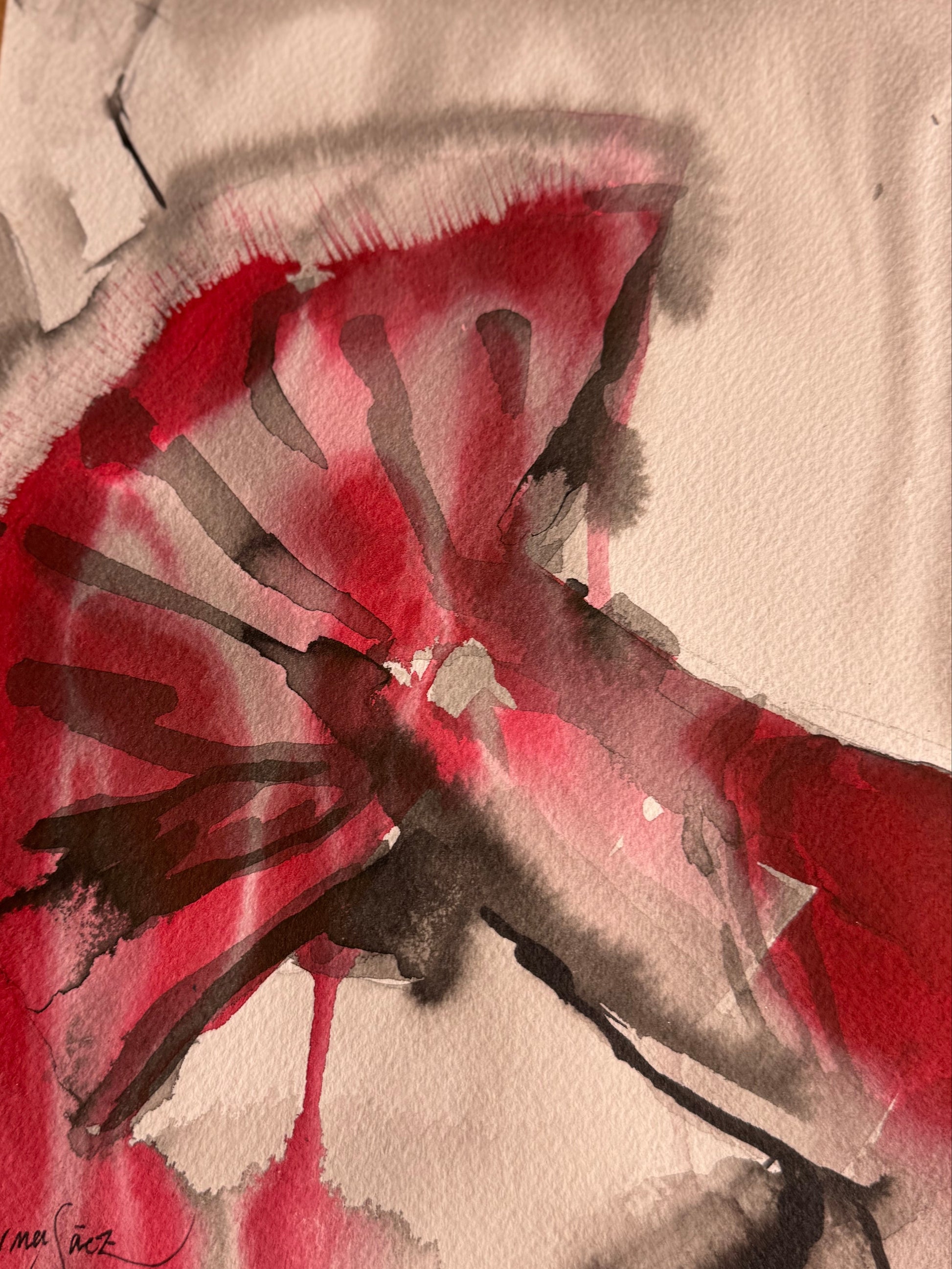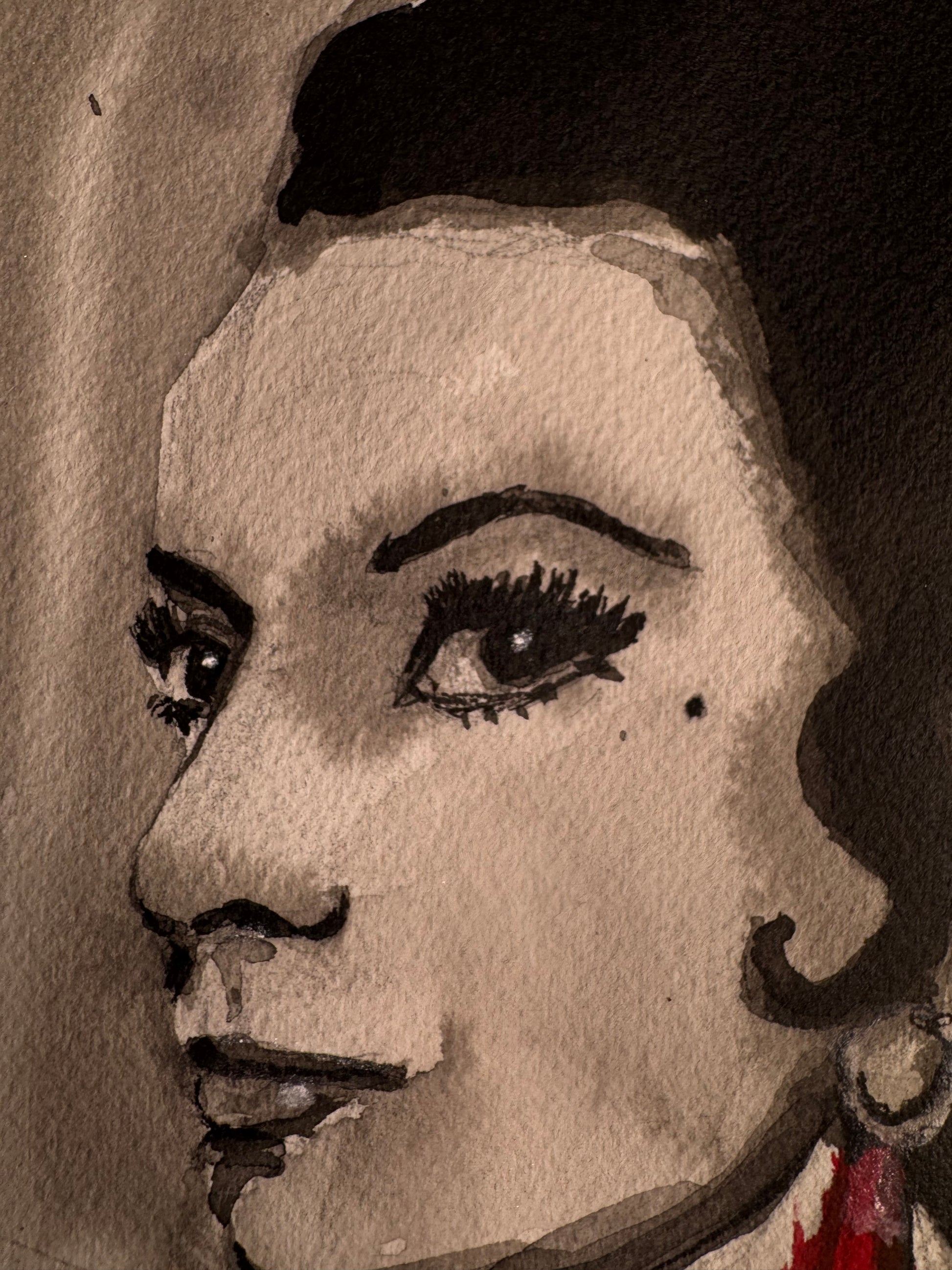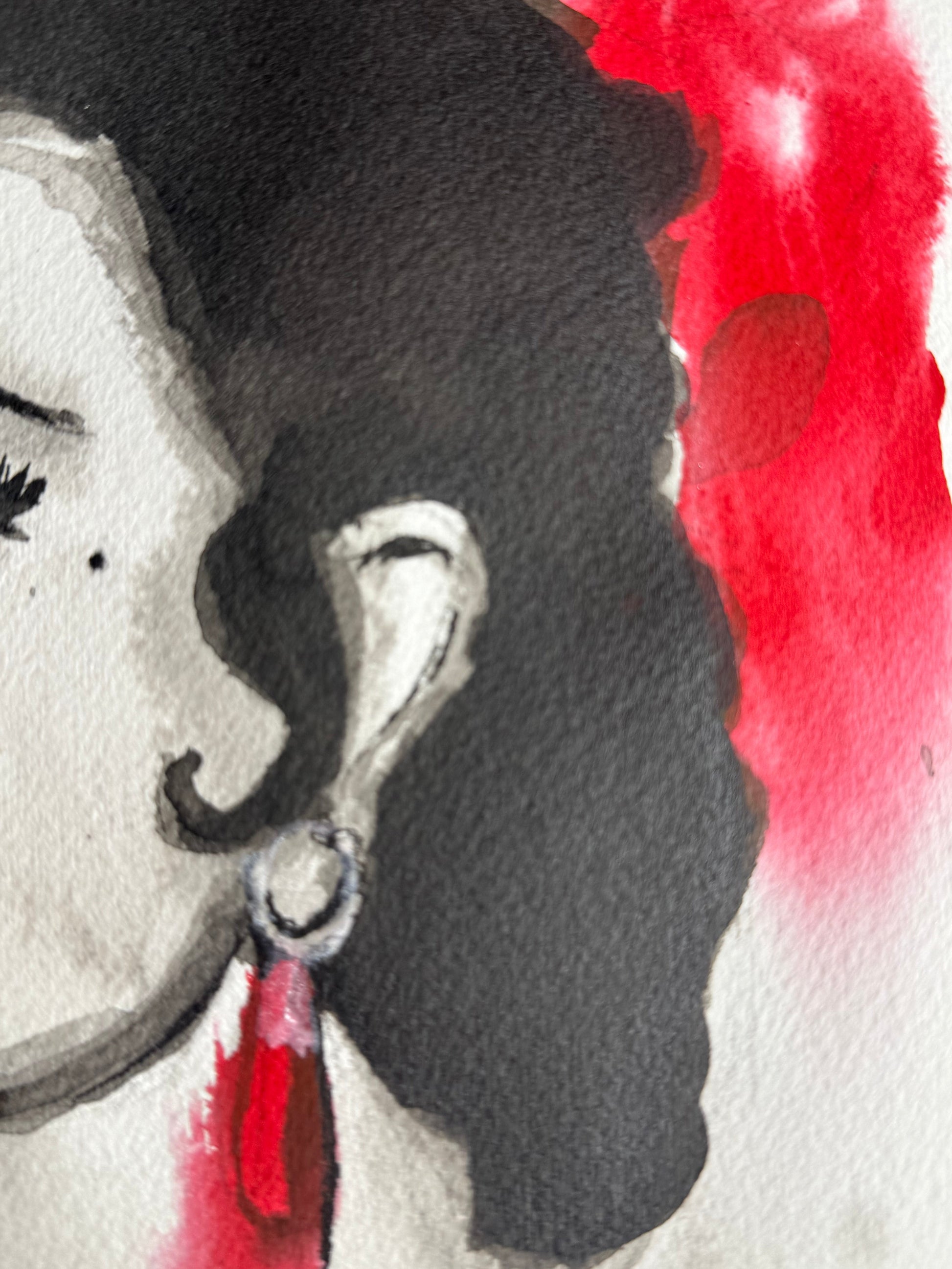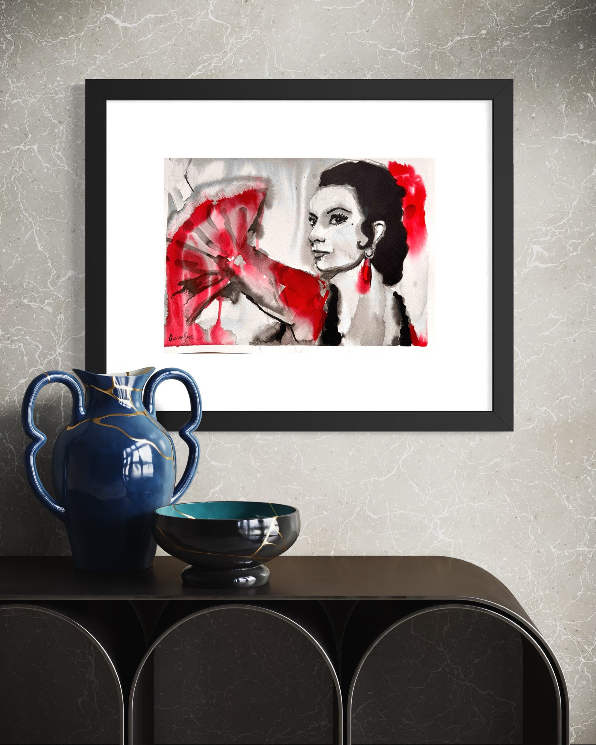 En esta obra la represento con la mirada elevada, orgullosa, con una presencia que trasciende el papel. El abanico rojo —abierto como un estallido— funciona como una corona en movimiento, una explosión de vida que envuelve toda la composición.