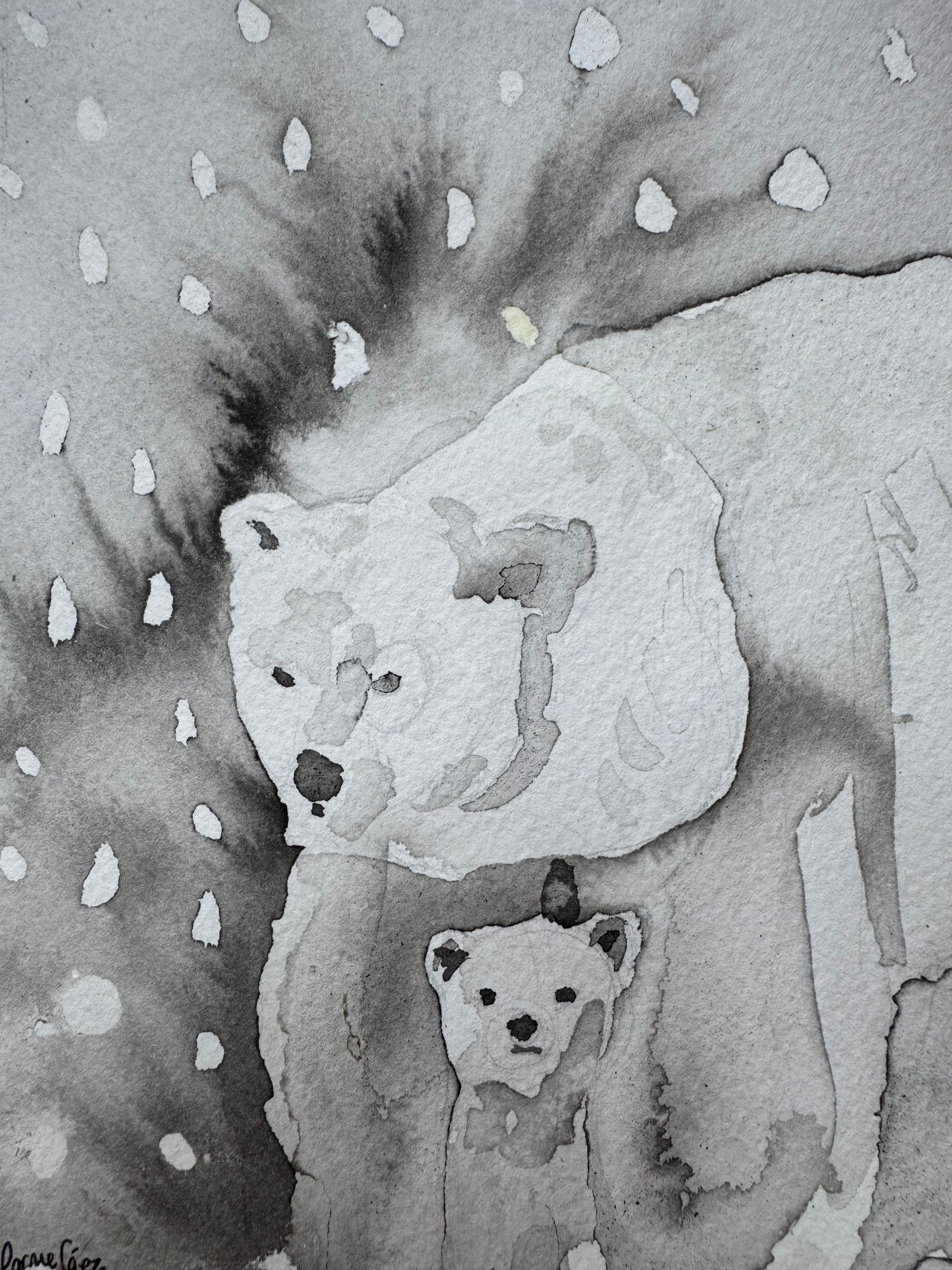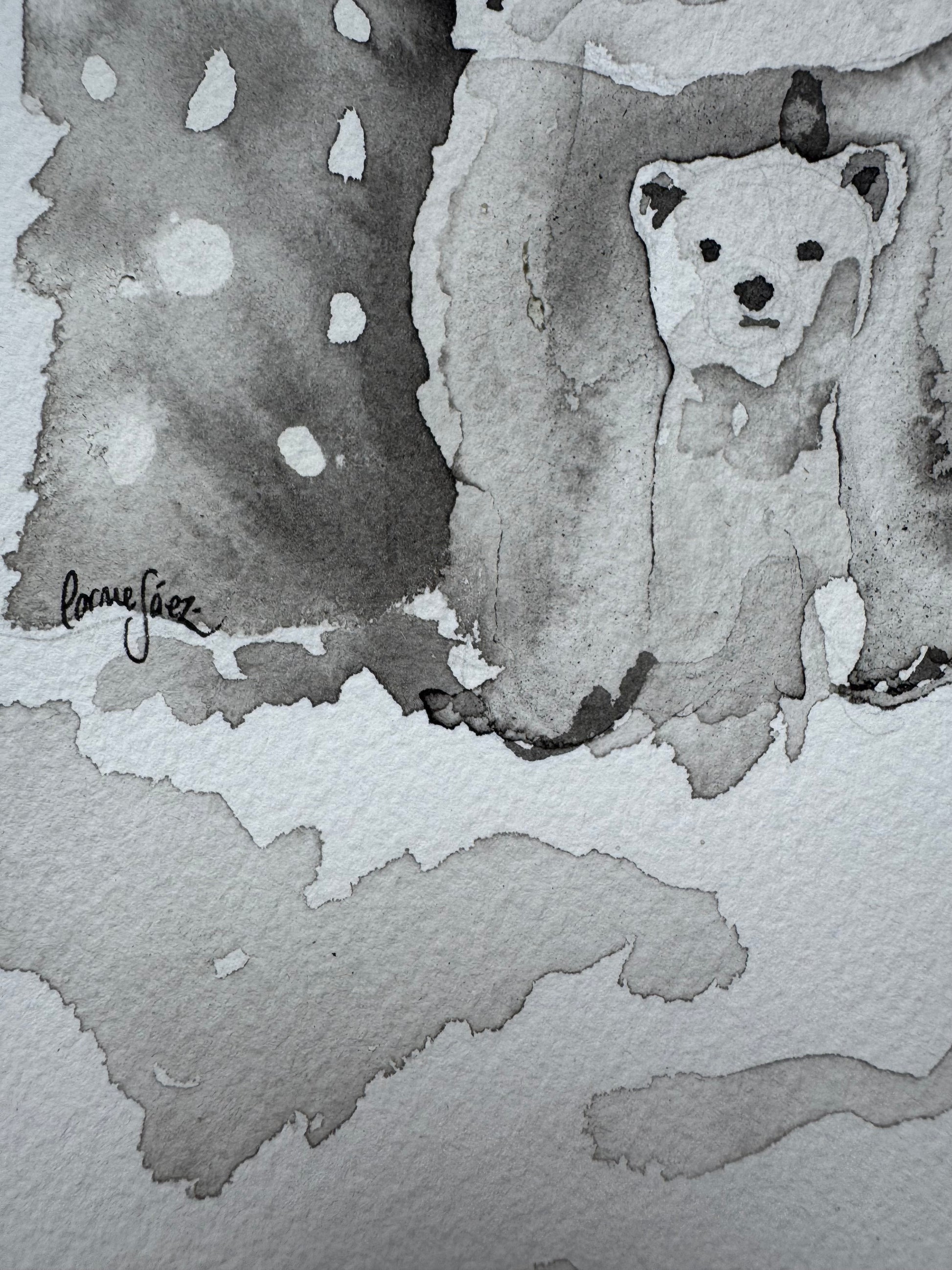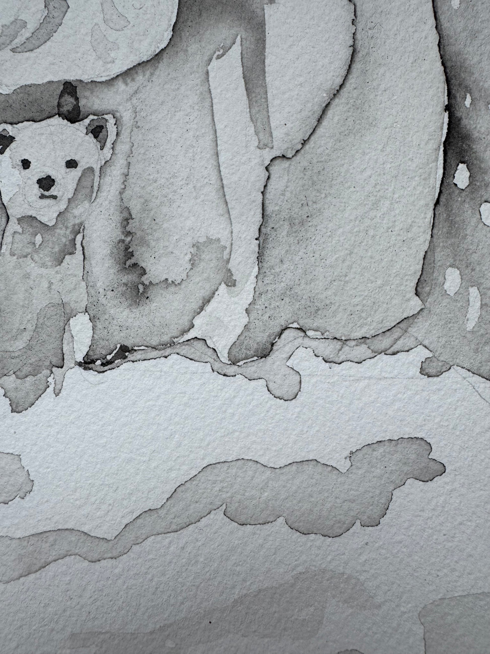 “Madre del Hielo — Refugio en el Ártico” es una obra en tinta inspirada en una de las historias más conmovedoras del mundo animal: la resistencia silenciosa de las madres osas polares.