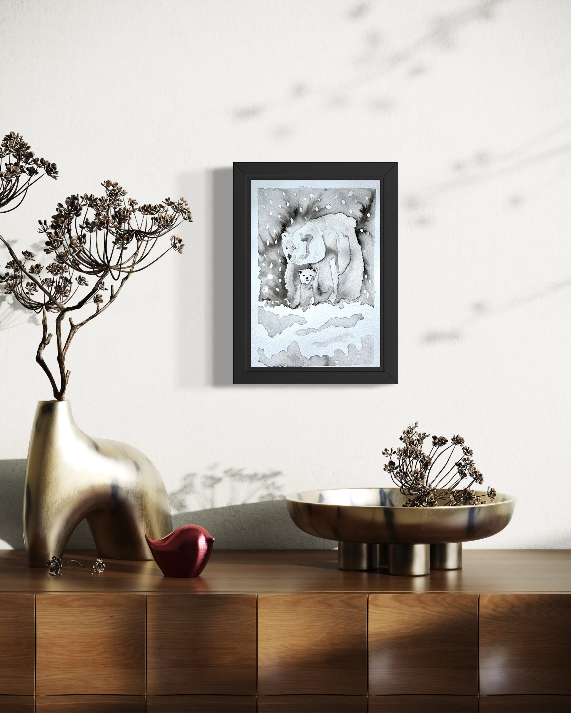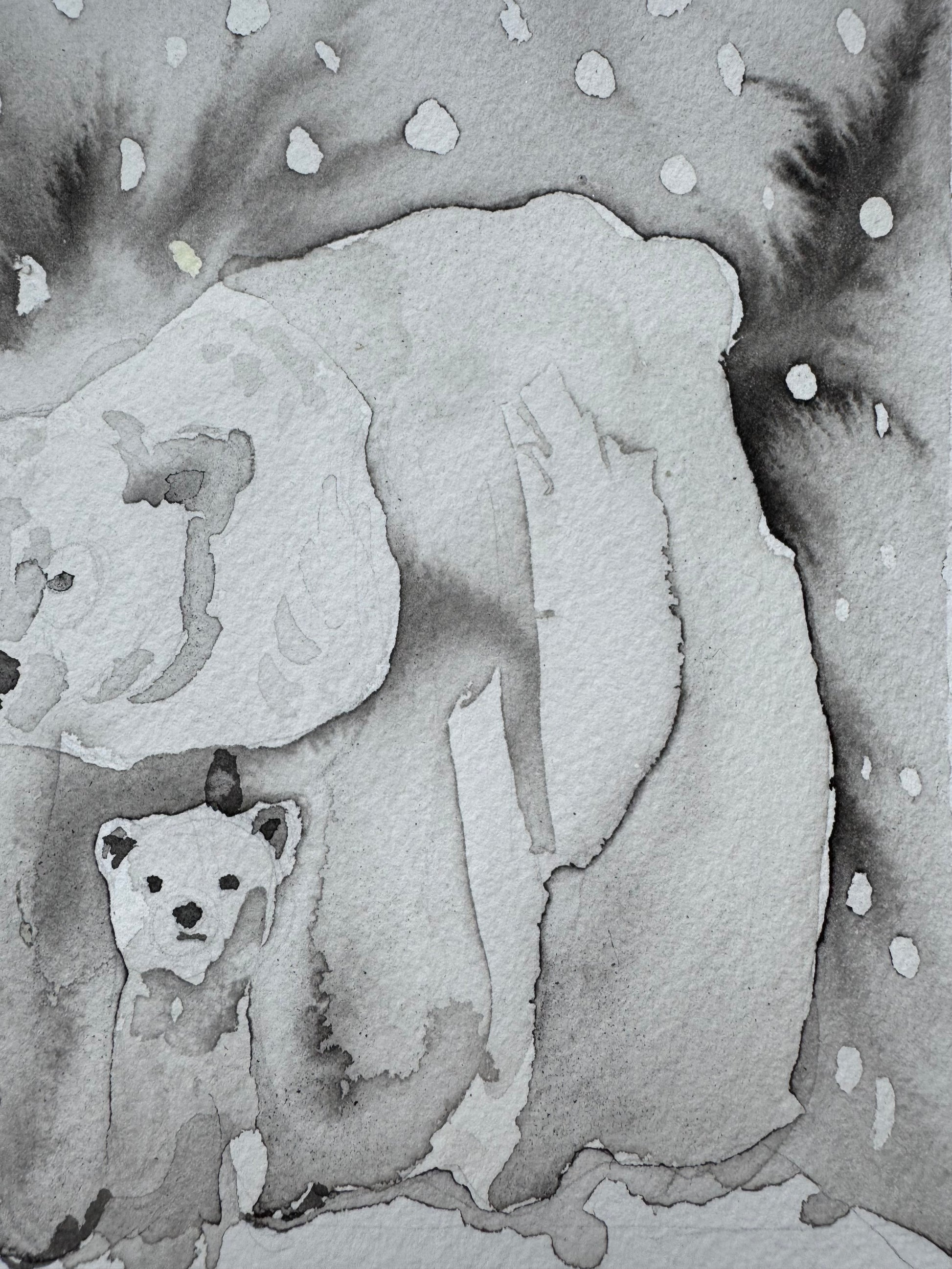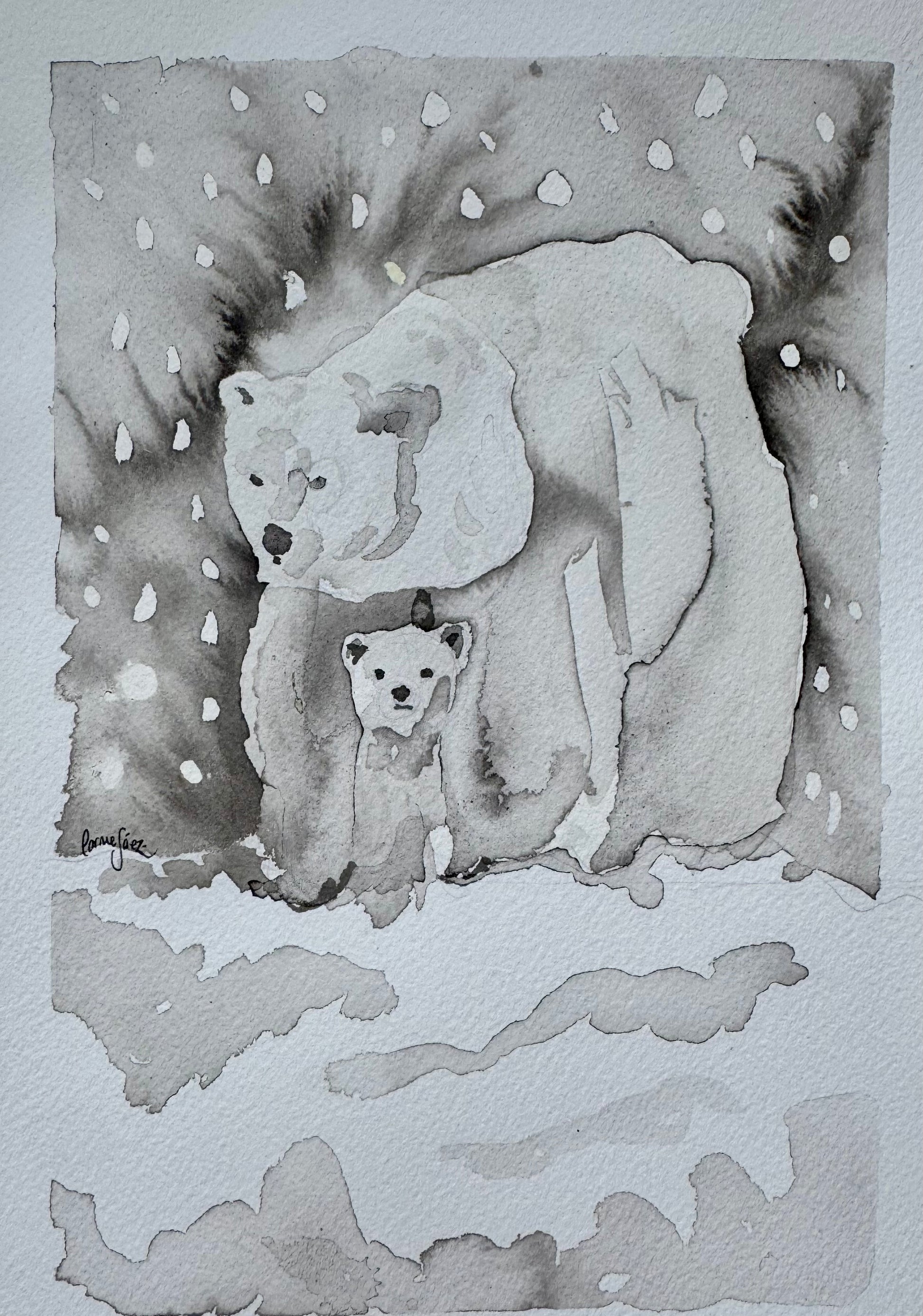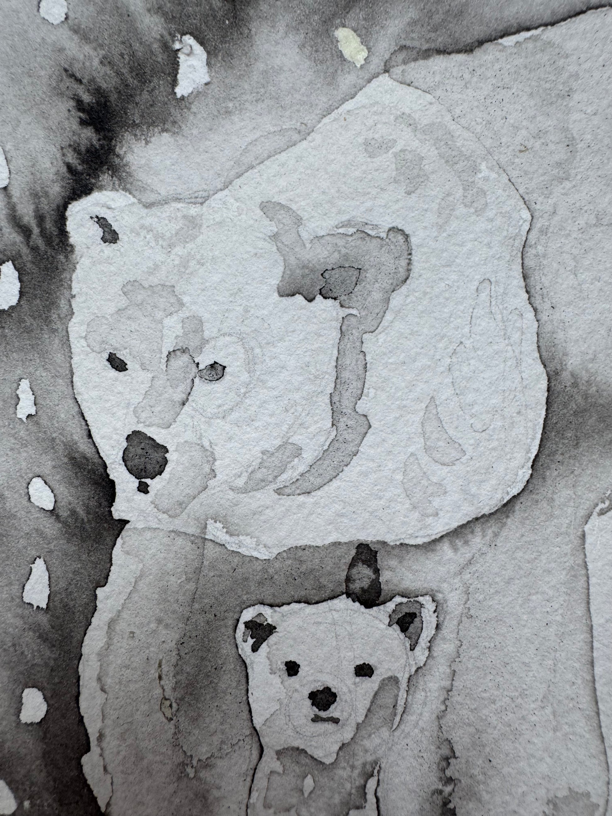 “Madre del Hielo — Refugio en el Ártico” es una obra en tinta inspirada en una de las historias más conmovedoras del mundo animal: la resistencia silenciosa de las madres osas polares.