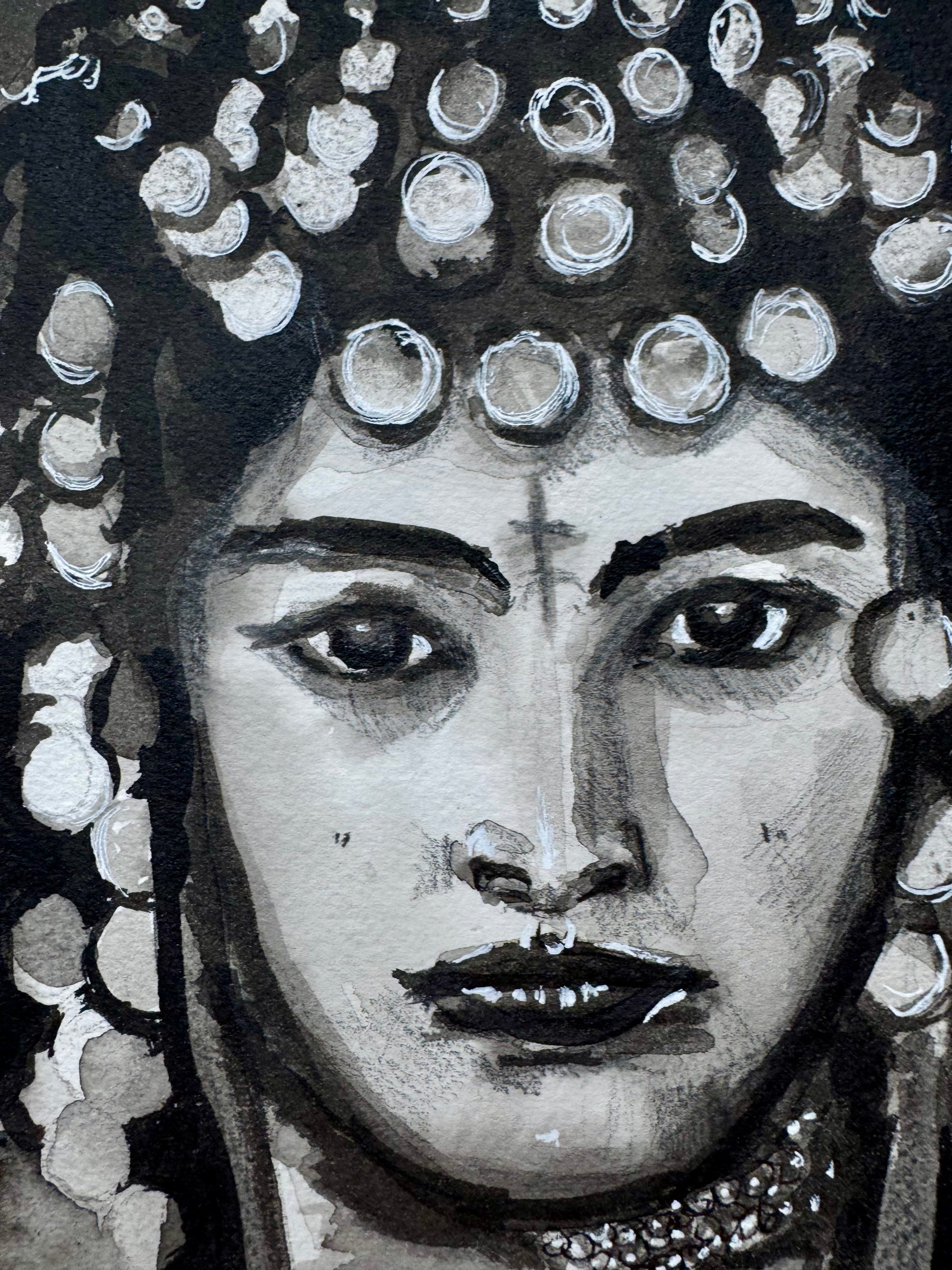 En esta pieza represento a una mujer amazigh con su ornamentación tradicional: marcas en la piel que cuentan historias, líneas que protegen, trazos que acompañan a lo largo de toda una vida.
