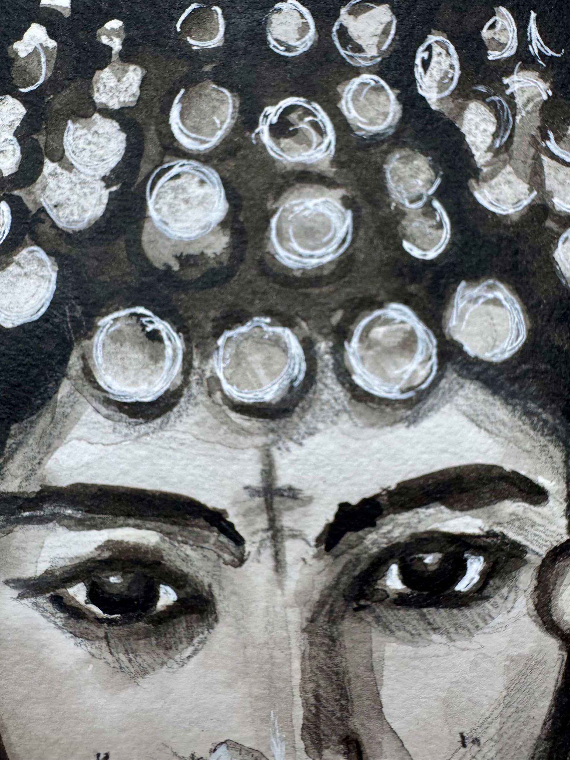 Mientras pintaba esta obra, sentí ese vínculo silencioso con todas las mujeres que han transmitido su identidad a través de gestos pequeños: un tatuaje, una joya, un dibujo. El retrato de esta mujer es un homenaje a esa fortaleza heredada, a esa resistencia delicada que viaja de generación en generación.